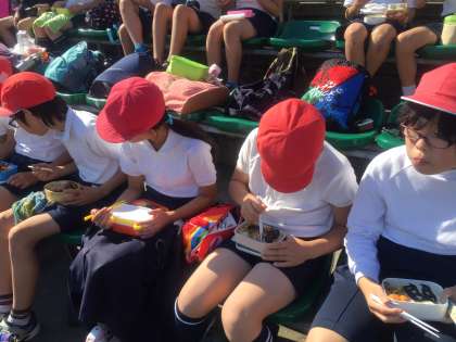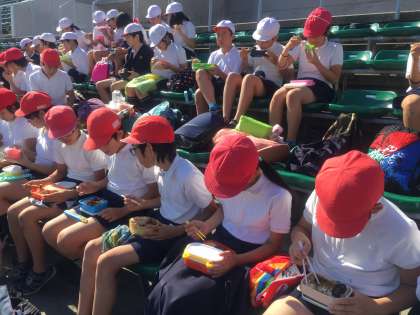 観覧席でお弁当を食べました。広くて、高くて、いい気持ちでした。