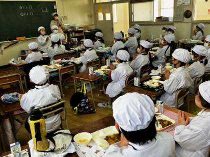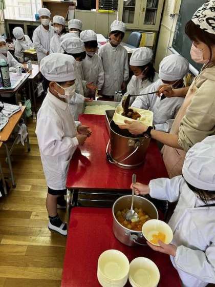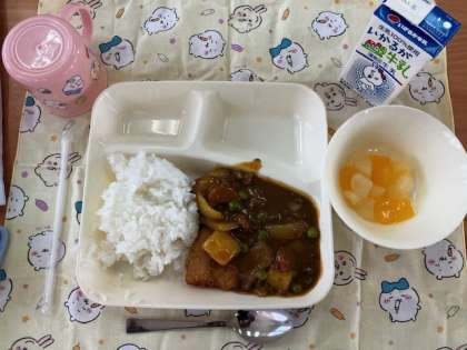 今日の給食献立は、入学祝い献立です。カツカレーライス・フルーツゼリー・牛乳です。