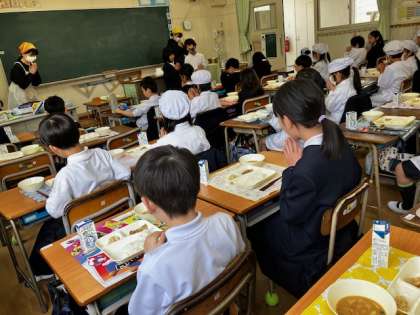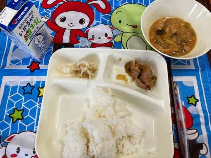 今日の給食献立は、ごはん・焼き鳥・もやしの柚子の香和え・味噌汁・牛乳です。