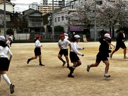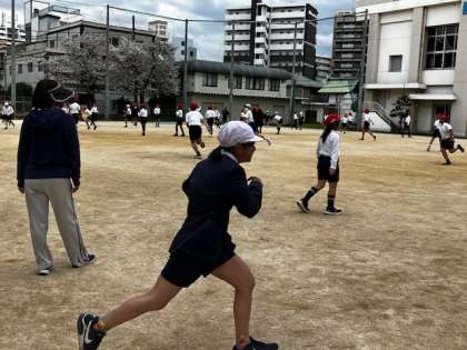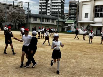まず前半は、学年全員でのオニゴ!運動場いっぱい使って、走り回ります。楽しそう!