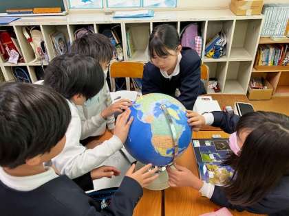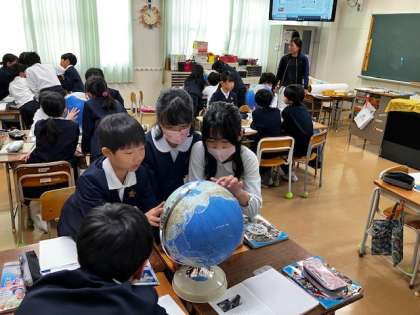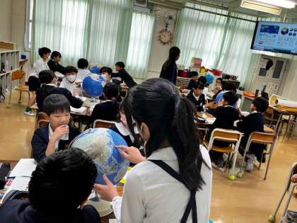 5年生の社会科の授業。世界地理を学習します。大きな地球儀が珍しくて、みんな興味津々です。