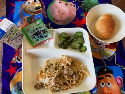 今日の給食献立は、ミニコッペパン・焼きそば・きゅうりの生姜漬け・ソフト黒豆・牛乳です。