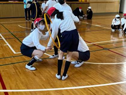 グループで手をつないだまま、フラフープの輪をくぐっていきます。1分間で何周できるか競います。