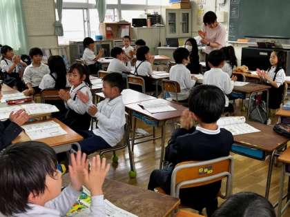2年生の音楽の授業。「手拍子リレーであそぼう」