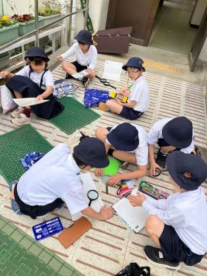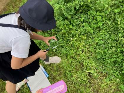 3年生の理科の授業。校庭の生き物観察をしています。草花や昆虫もたくさんいます。