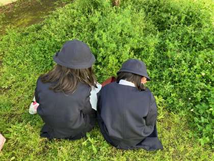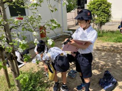 3年生の理科の授業で、校庭の草花や虫の観察をしています。虫メガネでよ〜く観て、ノートに描きます。