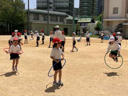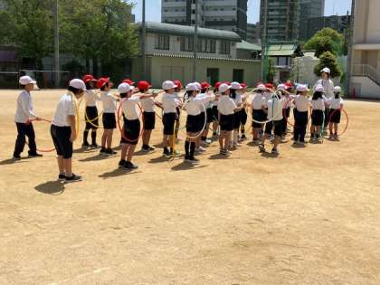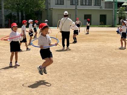 2年生の体育の授業。2年生もフラフープをしています。やはり1年間の成長で、レベルがずいぶんと高くなっています。