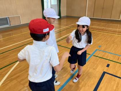 1年生、じゃんけんゲームで体操をしています。じゃんけん列車のような、そうではないような、そんなゲームです。