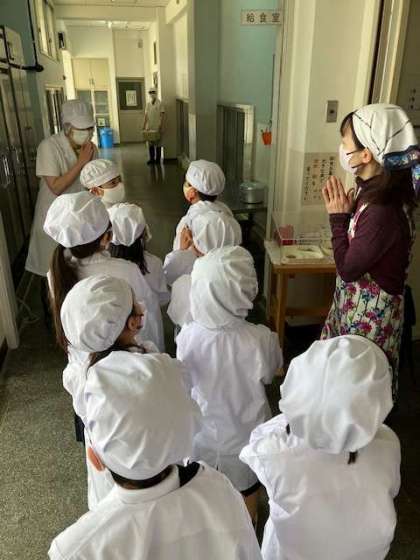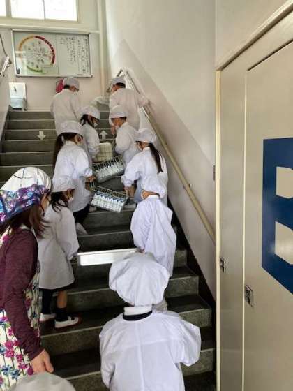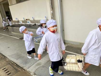 1年生が6年生の助けを借りずに、自分たちで準備をしだして一週間。だんだんと、運んだり配膳したりするのにも慣れてきました。