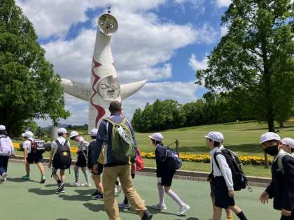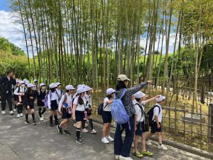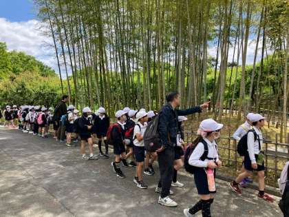 記念写真撮影をしたら、まずは自然学習館に向かいます。途中、川があってり、竹林があったり!普段は見ない風景に、歓声があがります。