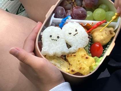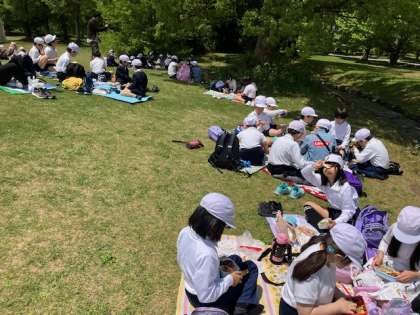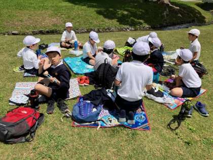 せせらぎの横の芝生でお待ちかねのお弁当です。