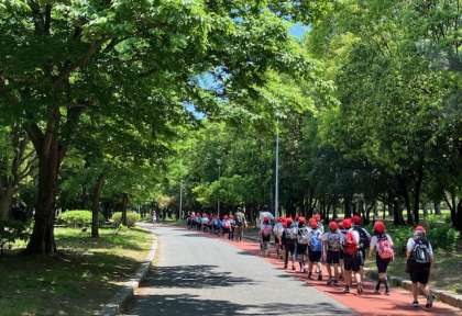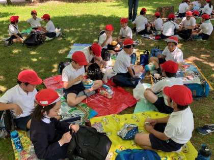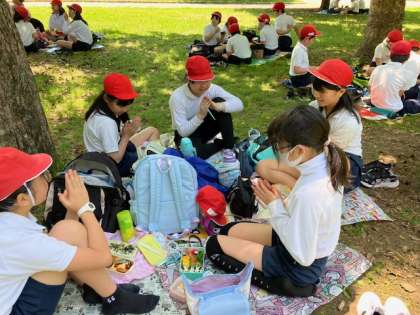 広い園内を移動して、お待ちかねのお弁当タイムです。もくもく元気広場の横で食べます。