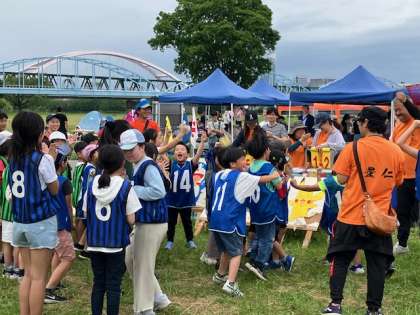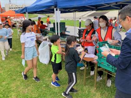 子どもたちは、おもちゃとおにぎり、コップをもらって、今から焼き肉を食べにいきます〜!
