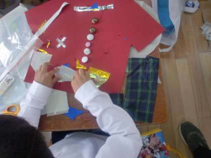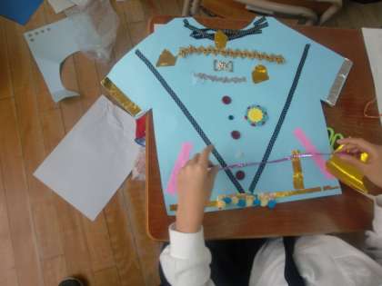 色画用紙の服に、えりやポケット、もようやボタンをつけて自分だけの「おしゃれなふく」を作ります。