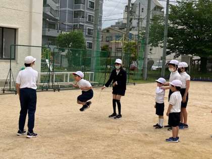投げるのを待つグループは6年生に長縄跳びをしてもらっています。