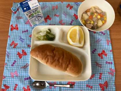 今日の給食献立は、レーズンパン・鶏肉とコーンのシチュー・キャベツときゅうりのサラダ・河内ばんかん・牛乳です。