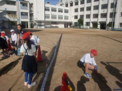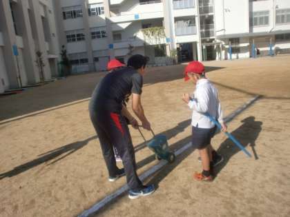 運動場にできた影の動きを調べました。