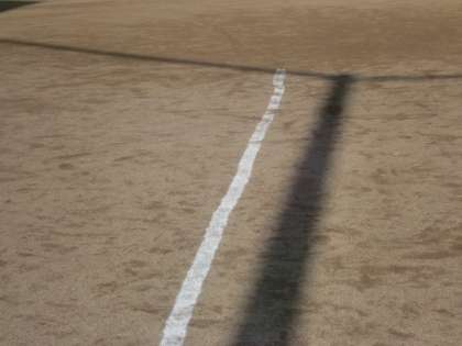 (上.中)防球ネットの支柱のかげに白線を引きました。