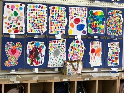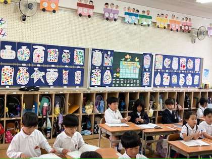 1年生の教室の壁に、カラフルな作品が並べられています。