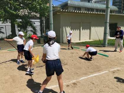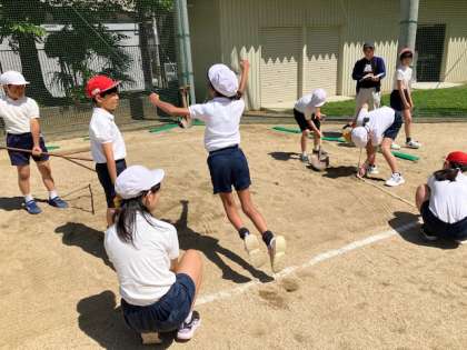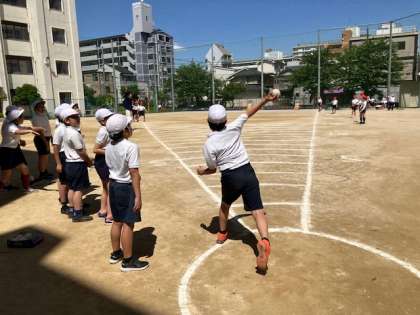 5年生の体力測定の様子。ソフトボール投げでは、さすが高学年、ずいぶんと飛んでます。