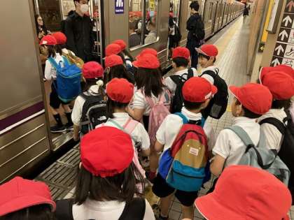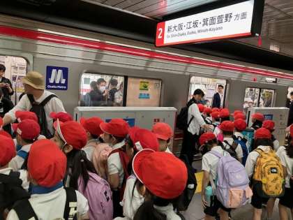 今日は、3年生の校外学習(春の遠足)です。服部緑地へ行きます。メトロを乗り継いでいきます。