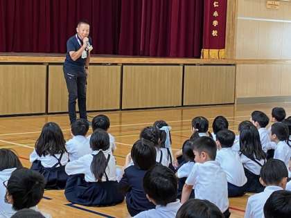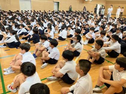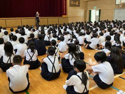 今日は月曜日、児童朝会の日です。今朝は北区役所地域課の「あんまち隊」の方に来ていただきました。