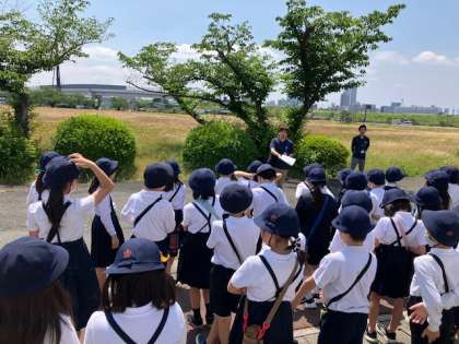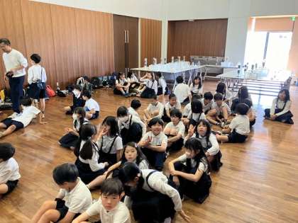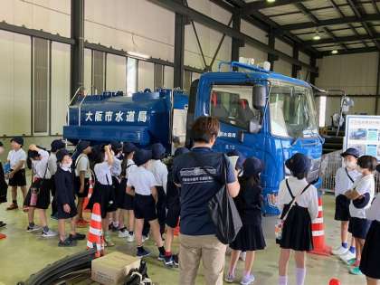 給水車も見せてもらいました。これから、オゾンや活性炭で水が浄化される実験をします。広い敷地を歩いたので、みんなクタクタ〜!