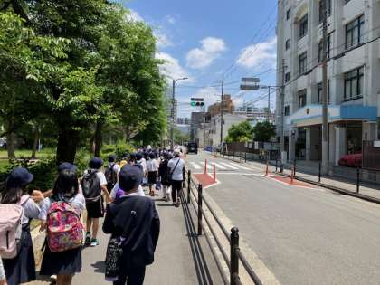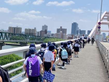 来た道、長柄大橋を渡って予定通り、全員無事、帰校しました。
