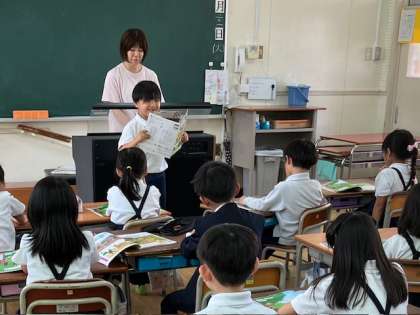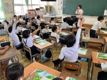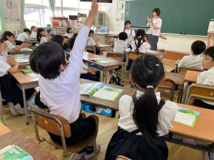 2年生の音楽の時間。「マネするなぁ〜!」と、一人が前で歌って、みんながこだまして歌っています。