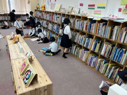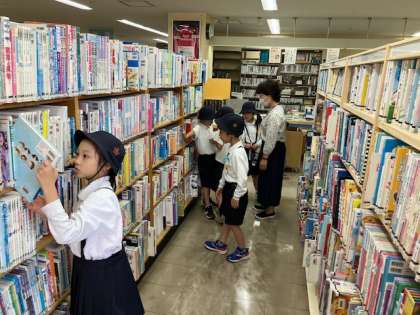た〜くさんの本の中から、お気に入りの本を選びます。図書館の方に質問して自分の好きな事柄の本を教えてもらったりもしています。