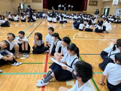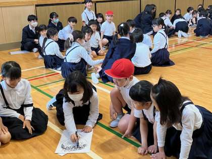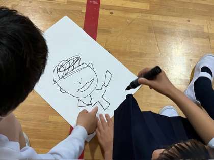 今日のゲームは「お絵かきリレー」。班の中で一人10秒ずつ描いていきます。お題は、本校で一番若いI先生の似顔絵です。
