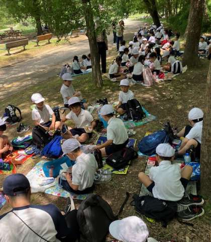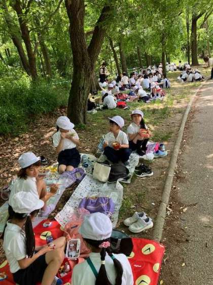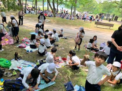池の辺りはどの学校もお昼場所に選びますね。涼しいし、眺めもいいですから。