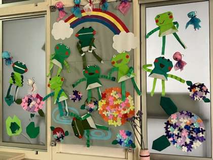 いきいき教室の飾りが、梅雨のカエルさんバージョンに変わりました!