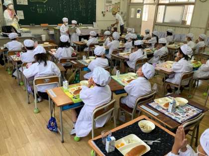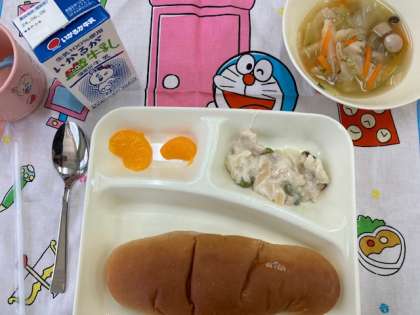 今日の給食献立は、黒糖パン・マカロニグラタン・キャベツのスープ・みかん(缶詰め)・牛乳です。