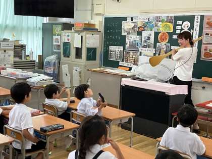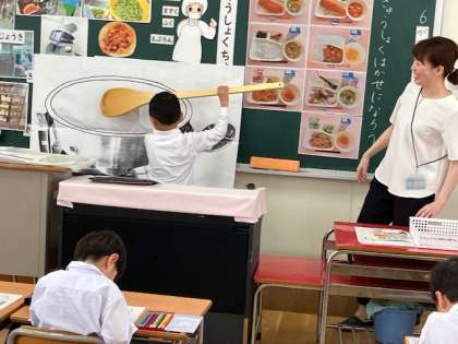 1年生の教室では、まず「給食」についてのお話をしてくださいました。調理員さんが普段使っている大きなしゃもじを実際に一人一人に持たせてもらう体験をしました。