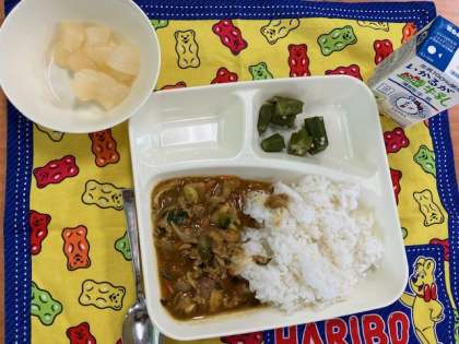 今日の給食献立は、和風カレー丼・オクラのかつお梅風味・和なし(缶詰め)・牛乳です。