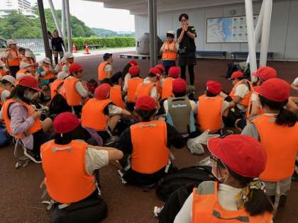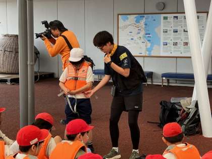 乗船前に、全員、ライフジャケットを着用します。つけ方を教えてもらって、確実につけます。