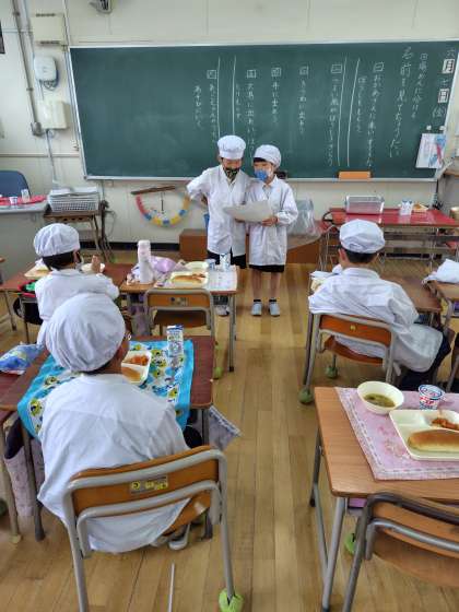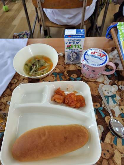 今日の給食は、えびのチリソース、中華スープ、ヨーグルト、コッペパン、みかんジャム
