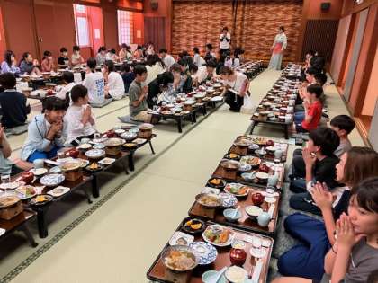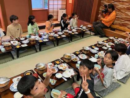 みんな、さすが子どもですね!疲れも見せず、楽しくワイワイみんなでお食事。これぞ、修学旅行〜ていう感じの食事風景です〜。