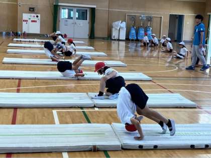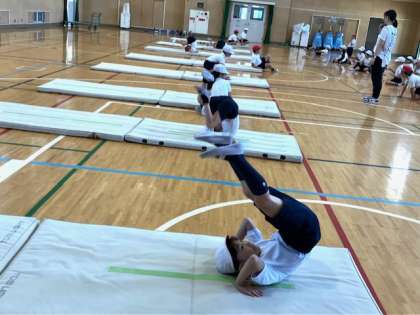 きれいな回転ができる子も、回りかけて崩れてしまう子もいますが、だんだんと上手になっていきます。45分の授業の中で、着実に上達していってます。