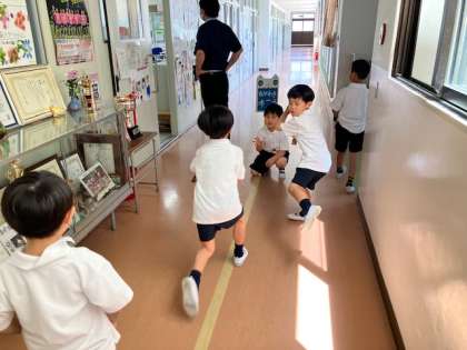 すぐ隣では、大谷さんからの贈り物のグローブを使って、エアー野球をしていました。職員室前に大谷グローブを置いてるので、今日はそれを使った遊びを始めました。