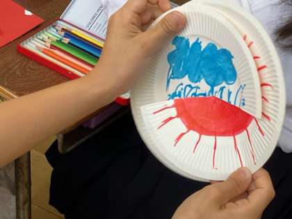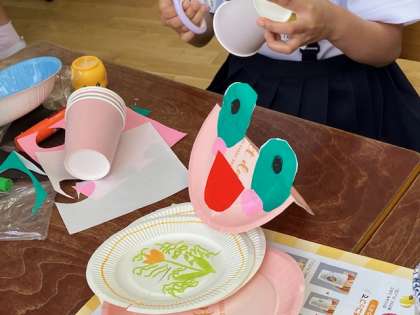 紙皿2枚で楽しいオモチャを作っています。お皿に切り込みを入れて、楽しいカラクリになるようなくふうをしています。