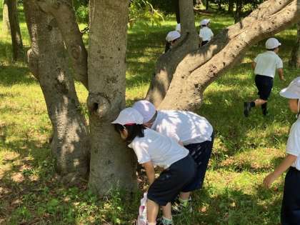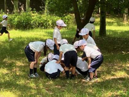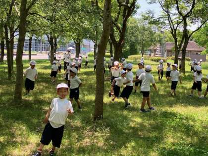 大きな木が珍しいのか、じっ〜と見つめたり、キノコが珍しく」キノコやー!」という声に大勢が集まってきたり。森の中を自由に走り回っています。