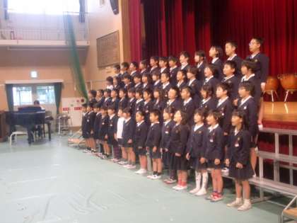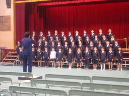 大野先生の指揮、磯部先生のピアノ伴奏で「世界がひとつになるまで」の合唱をしています。