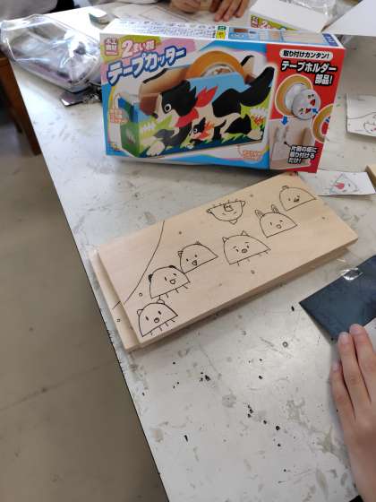 6年生は、図工の学習で「テープカッター作り」に取り組んでいます。パソコンで描きたい図柄を考え、板に写していきます。その後、電動のこぎりで回りを切り、色を付けます。