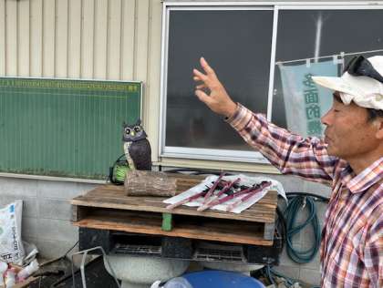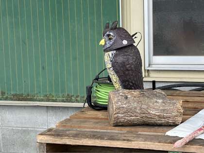 フクロウの声が聞こえるなぁ、と探してると、小屋の前に機械のフクロウがいました。