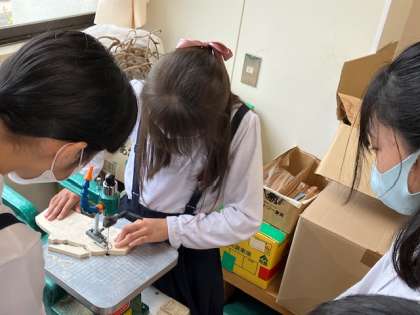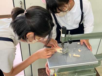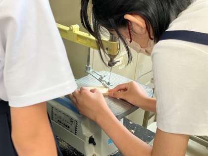 6年生の図工。テープカッター作りをしています。図工室の電動糸ノコを使ってます。