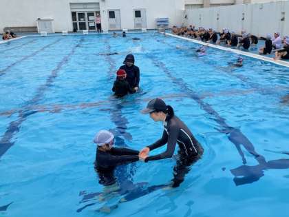 前で指示を出す先生の他に、3人の先生が水の中で、手を引いて教えてくれています。