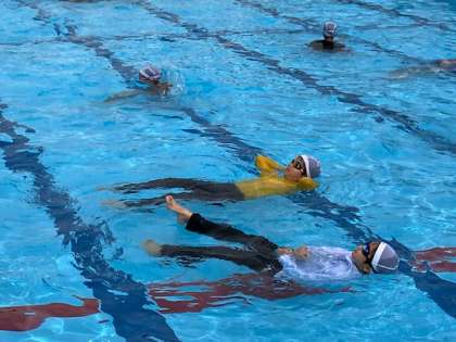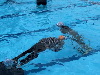 いざという時に、ペットボトルを投げ入れてもらって浮く練習。ペットボトルがない場合、自分の服に空気を入れて浮く練習にチャレンジしてみました。