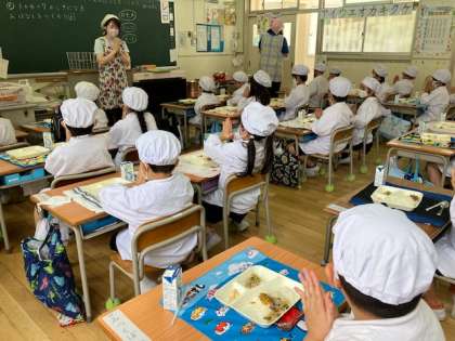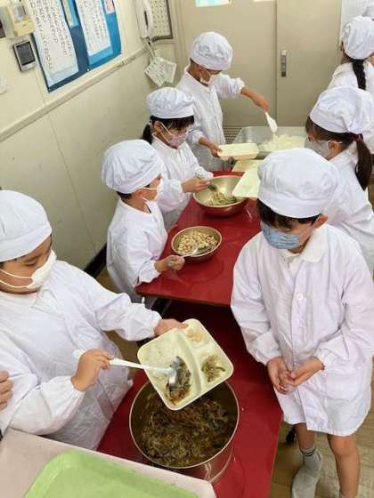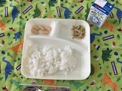 今日の給食献立は、牛丼・もやしとピーマンのごま炒め・大福豆の煮物・牛乳です。